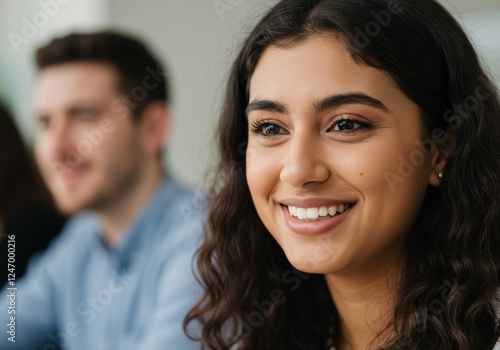 Diverse group of students smiling and discussing ideas in a classroom environment