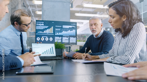 Diverse Group of Successful Business People in the Conference Room, Work on a Company's Growth, Share Charts and Statistics. In the Background Wall TV with Corporate Data on it.
