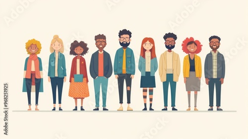 Diverse Group of Trendy Young Adults Standing in a Line, Casual Fashion, Smiling, Flat Vector Illustration