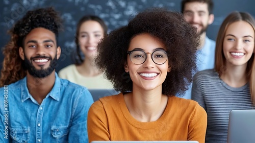 Diverse group of young happy students or professional colleagues working together collaborating on laptops or digital devices in an office or learning environment