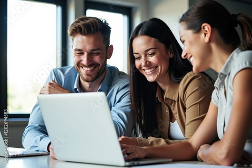 Diverse Group of Young Professionals Collaborating on a Laptop in Modern Office Setting, Showcasing Teamwork, Innovation, and Creativity in Business