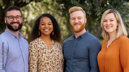Diverse group portrait of a community outreach team smiling and working together towards a shared goal