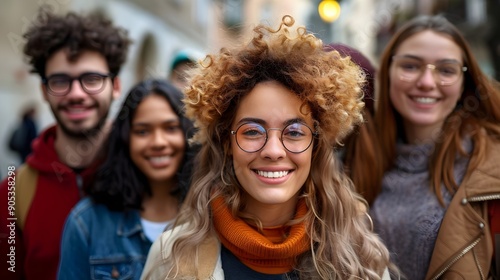 Diverse Group Smiling Young Friends Urban Setting Outdoor Happiness Together. AI Generated