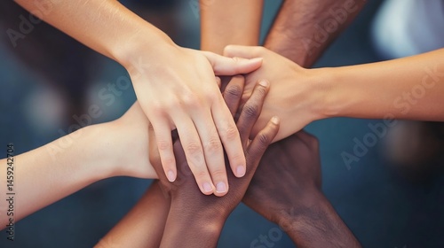Diverse hands clasped together, symbolizing unity, teamwork, and collaboration. A powerful image representing inclusivity and shared goals. : Generative AI