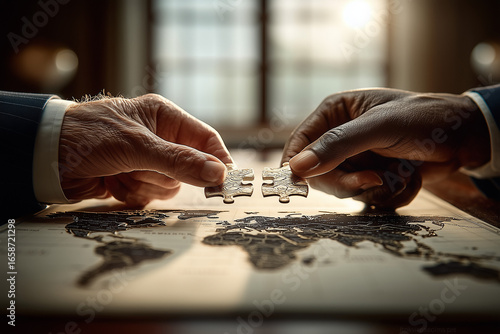Diverse hands connect two halves of a puzzle-piece world map. A metaphor for peace, collaboration, and diplomatic reconciliation.