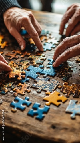 Diverse hands working together solving puzzle pieces on rustic wooden table