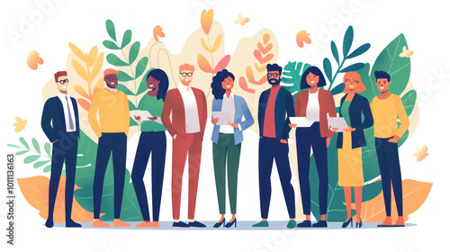 Diverse individuals standing in front of a large, inclusive corporate logo, smiling and engaging.