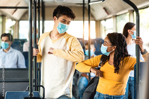 Diverse multicultural people wearing face masks greeting and bumping elbows