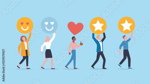 Diverse people holding social media feedback icons for customer satisfaction concept