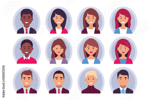 Diverse Profile Pictures: A collection of avatar portraits, representing diverse individuals with varied skin tones, hair styles, and expressions, ideal for use in user interfaces, social media.