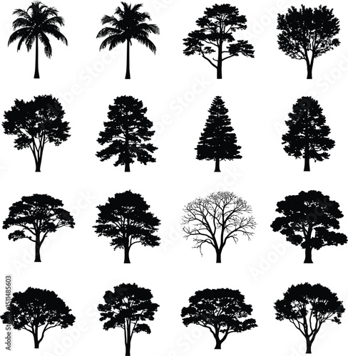 Diverse silhouettes of various trees representing different foliage and styles for design projects