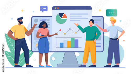 Diverse team collaborates on financial data analysis and presentation isolated on white background