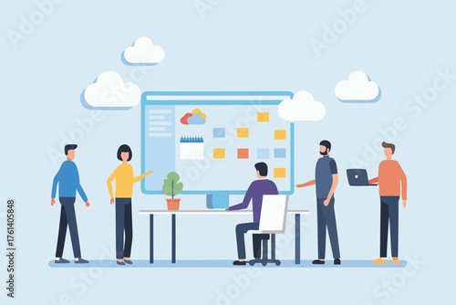 Diverse team collaborating around a computer screen displaying a calendar and weather forecast on a light blue background with clouds