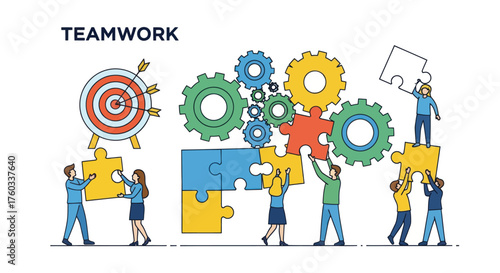 Diverse Team Collaborating to Assemble Puzzle Pieces and Achieve Goals.