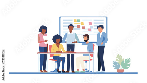 Diverse team of professionals collaborating around a table with a laptop and a whiteboard with sticky notes in a modern office setting