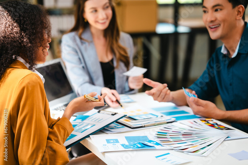 diverse team of professionals engaged in a website graphic design board meeting, sharing opinions on UX and UI design elements. Asian man, African American people, black, afro, caucasian female