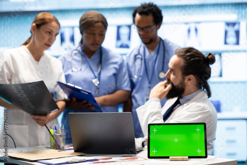 Diverse team of specialists examining radiography test scans with isolated screen in a meeting, reviewing x ray results at a treatment center. Professional staff ensuring disease prevention.