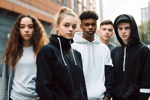 Diverse teenagers wearing modern and trendy. Outdoor urban style. Generative AI