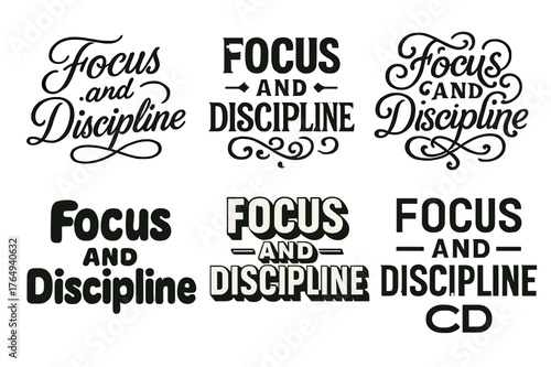 Diverse Typography Variations. Focus and Discipline. Set lettering. harmonious lettering variations of the same emblematic concept, each with different