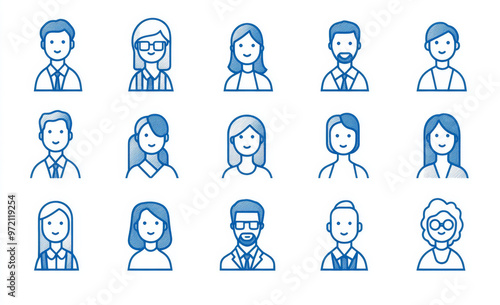 Diverse User Profile Icons: Blue Outline: A vibrant set of 15 diverse user profile icons, designed in a modern blue outline style. Perfect for user interfaces, websites, and apps.