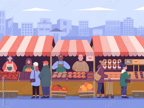 Diverse Vendors and Shoppers at a Vibrant City Market