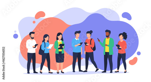 Diverse young people actively engage with digital tablets and smartphones, illustrating modern communication, social networking, and technological integration.