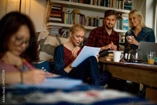 Diverse young people studying together at home