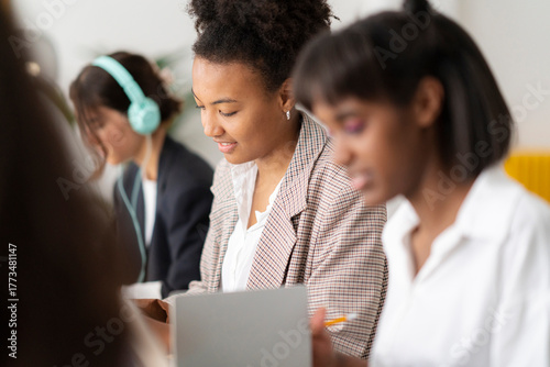 Diverse young women are engaged in focused work within a modern office setting. They are concentrating on tasks, utilizing laptops, and taking notes collaboratively.