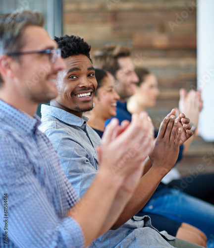 Diversity, colleagues with applause and in a meeting room of their workplace for happiness. Achievement or success, support and coworkers clapping together at workshop or seminar in a boardroom