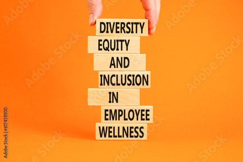 Diversity equity inclusion symbol. Concept words Diversity Equity and Inclusion in employee wellness on wooden block. Beautiful orange background. Diversity equity inclusion concept. Copy space.
