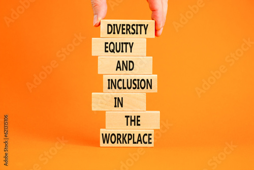 Diversity equity inclusion symbol. Concept words Diversity Equity and Inclusion in the workplace on wooden block. Beautiful orange background. Diversity equity inclusion workplace concept. Copy space.