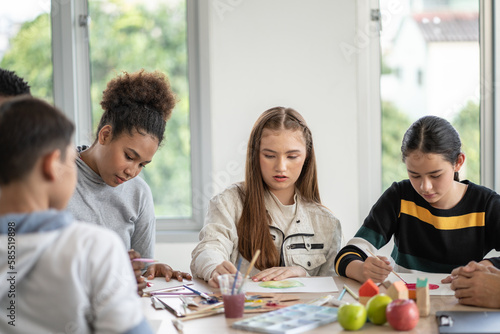 Diversity group of students drawing and painting in Arts class with African American teacher. kid enjoy practicing art skill, creative thinking idea. school activity, learning and education concept