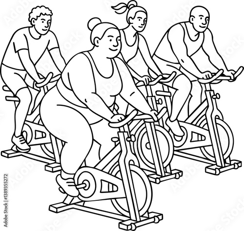 Diversity in Exercise & Wellness aerobics concept. Group of individuals engaging in indoor cycling exercise.