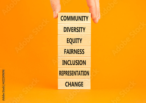 Diversity inclusion symbol. Concept words Community Diversity Equity Fairness Inclusion Representation Change on wooden block. Beautiful orange background. Diversity equity inclusion concept.