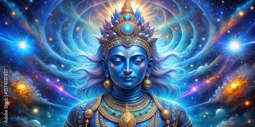 Divine Blue Deity surrounded by stars and galaxies in a celestial universe with vibrant colors and intricate details