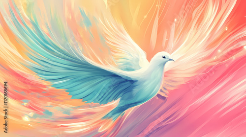 Divine light flat design abstract white bird in concept freedom sacred theme cartoon drawing colored pastel. Seraphic. Illustration