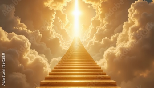 Divine Pathway A stunning view of a golden staircase ascending through fluffy, radiant clouds, leading to a brilliant, golden sunbeam breaking through the heavens