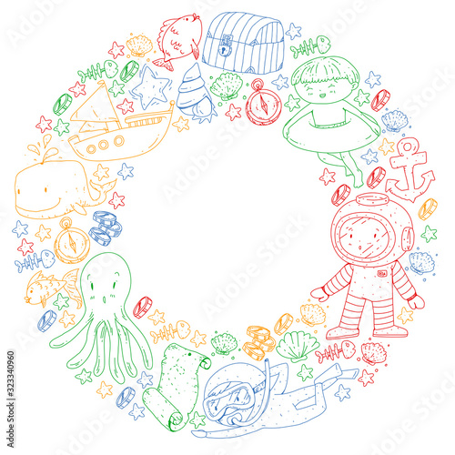Diving pattern with children. Octopus, whale. Summer adventure with pirates and treasures. Underwater.