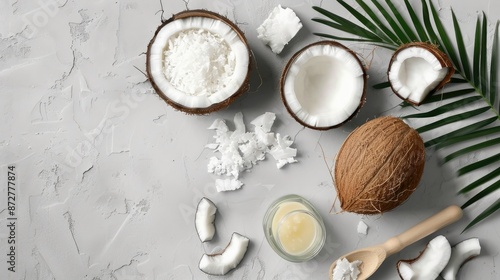 DIY cosmetics concept with coconut ingredients on gray backdrop
