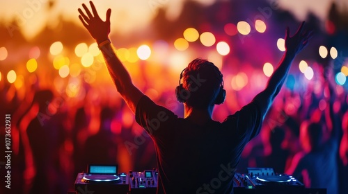 DJ performing at an energetic outdoor festival with vibrant lights and crowd celebration.