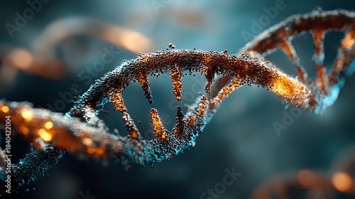 DNA double helix structure with glowing orange highlights on blue background for scientific research and biotechnology presentations.