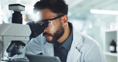 DNA, man and scientist with microscope in laboratory for research with medical innovation. Biotechnology, professional and male biologist with RNA for pharmaceutical study or discovery in healthcare.