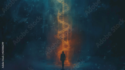 Dna strand in a dark background, in the style of light sky-blue and light orange, enchanting realms, algernon blackwood, vibrant stage backdrops