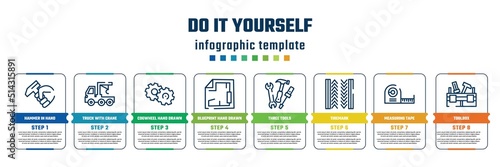 do it yourself concept infographic design template. included hammer in hand, truck with crane, cogwheel hand drawn tool, blueprint hand drawn tool, three tools, tiremark, measuring tape, toolbox