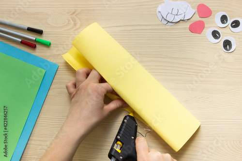 do it yourself: Easter sweets decor: wrapping a chocolate bar in the shape of an Easter bunny. step 9: a person's hands glue yellow paper with a glue gun,