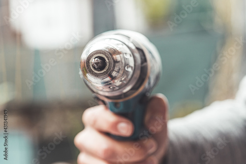 Do it yourself: Home Handyman is holding a cordless screwdriver, outdoors