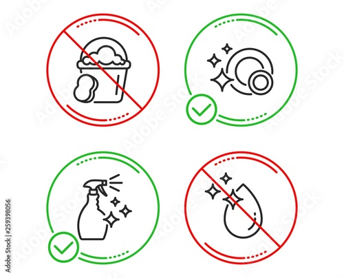 Do or Stop. Sponge, Washing cleanser and Clean dishes icons simple set. Water drop sign. Cleaner bucket, Housekeeping spray, Dishwasher concept. Crystal aqua. Cleaning set. Line sponge do icon