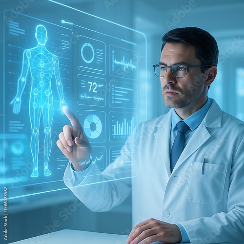 Doctor Analyzing Biometric Data on a Futuristic Holographic Interface