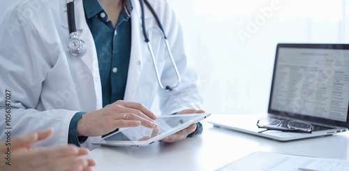 Doctor and a patient. The physician, wearing a white medical coat over a green shirt, is using tablet computer during a consultation in the clinic. Medicine concept