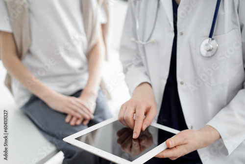 Doctor and child patient. The doctor is using tablet computer and is ready to examine the boy. The concept of ideal health in medicine.